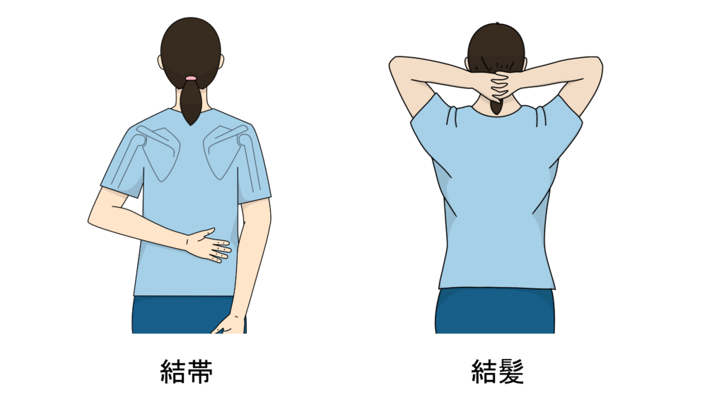また腕を上げる動作や結滞動作(腰に手を回す動き)、結髪動作(頭の後ろに手を回す動き)などの様々な動作で制限が出ます。